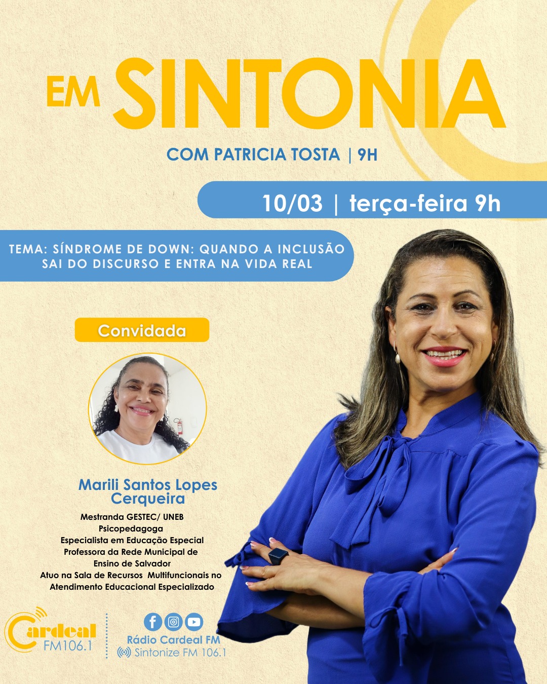 Na próxima terça-feira, dia 10/03, no Programa Em Sintonia , da Cardeal FM 106.1, Patrícia Tosta entrevista :