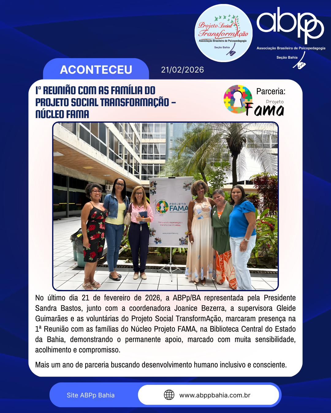 No último dia 21 de fevereiro de 2026, a ABPp/BA representada pela Presidente Sandra Bastos, junto com a coordenadora Joanice Bezerra, a supervisora Gleide Guimarães e as voluntárias do Projeto Social TransformAção, marcaram presença na 1ª Reunião com as famílias do Núcleo Projeto FAMA, na Biblioteca Central do Estado da Bahia, demonstrando o permanente apoio, marcado com muita sensibilidade, acolhimento e compromisso.